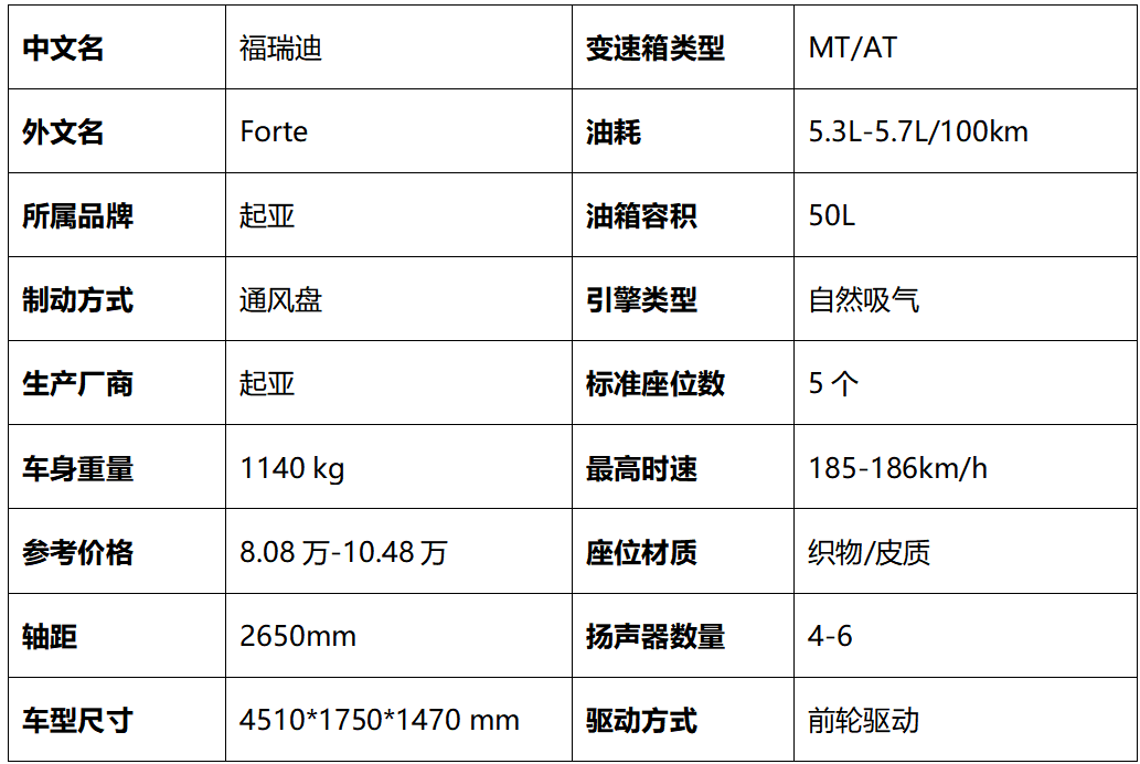 福瑞迪(Forte)最早于2009年6月上市,共推出6款车型,提供1.6L及2.0L动力,搭载MT及AT变速箱。此外,为纪念成立十周年,起亚特别向市场中推出福瑞迪纪念版车型,新车主要对造型设计与配置进行了升级调整。目前,福瑞迪提供4款在售车型,均搭载1.6L发动机。